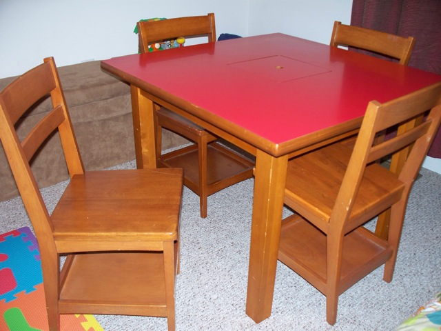 This was the old (atleast 10 yrs) pottery barn table that I found on Craig's list for the Munchkin's christmas present. It's the sturdiest table and so cute in her playroom.